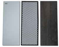 - Interchangeable wood, clear tempered glass and metal mesh door panels