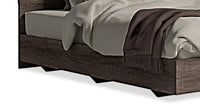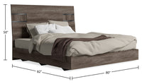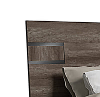 - Vintage oak-look laminate coats the panel headboard for a rugged feel, modernized with chrome accents.