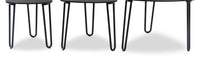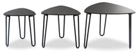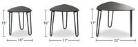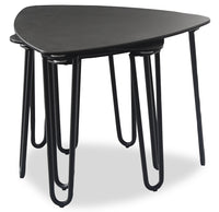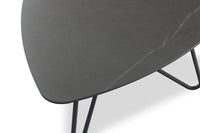 - Modern profile with rounded triangular tabletops on hairpin legs.