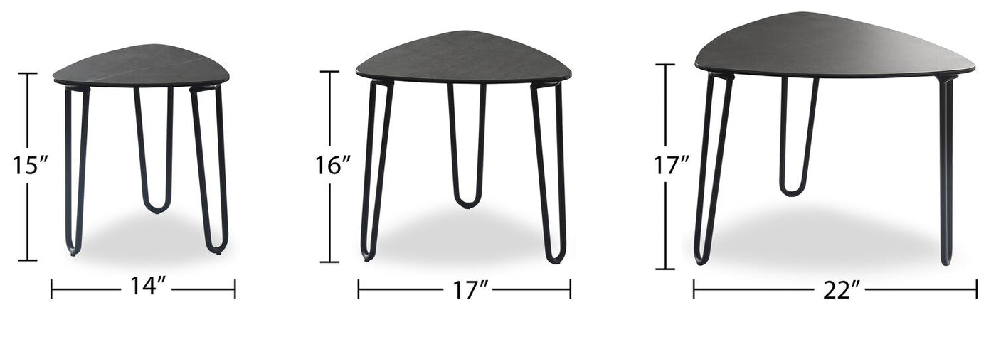 If you want to enhance your living room with refined elegance, you need these Dover nesting tables. Sporting a modern silhouette thanks to its rounded triangular tabletops, this set offers broad surfaces to comfortably rest your food and drinks. Painted Italian ceramic over tempered glass mimics the look and feel of marble in a beautiful grey finish with white veining. When you need additional space, you can create a larger layered table effect by overlapping the three tables. The Dover is the missing piece you didn’t know your living room needed.