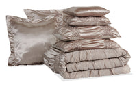 Show off your marvelous style with the fancy flair of this Elaine seven-piece queen comforter set. Bathed in a gorgeous taupe finish colour and enhanced with ruched detailing, this set was designed to be showcased. Effortlessly complete your bedding setup with two shams, two euro shams, a comforter and two coordinating decorative cushions. Plus, enjoy a cozy rest as you lie down on the soft, shiny material. Exquisite and alluring, the lovely Elaine comforter set will become your best friend for beauty sleep.