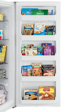 Easily organize your family's frozen favourites with this 13-cubic-foot upright freezer from Frigidaire. Four adjustable, metallic wire shelves, a deep bottom basket and five spacious door bins allow you to make the most of every available square inch of space. The EvenTemp™ cooling system is designed to maintain the ideal temperature inside keeping your foods cold and fresh. Plus, an audible alarm will alert you if the door is accidentally left open for too long. Power outage? Don’t worry – the tight seal can keep your food fresh for up to two days in case of emergencies.