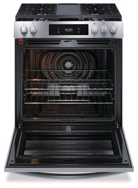 Enjoy precision cooking with this Frigidaire Gallery gas range. The Total Convection system enables cooking modes like No Preheat, Air Fry, Slow Cook, Steam Bake, Air Sous Vide and more for incredible culinary results. The flexible five burner cooktop includes a powerful 18,000 BTU Quick Boil Burner and a center oval burner with an integrated cast iron griddle. Plus, this range features backlit LED knobs, a premium touch screen digital control panel and a fingerprint resistant stainless steel finish for sleek style in the kitchen.