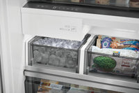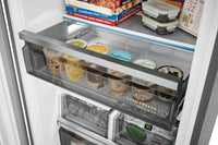 - SpaceWise® Organization System - Easily organize your family's favorites with our adjustable smudge-resistant stainless steel (metal?) shelving, movable full-width dark tinted door bins with metallic trim, divided bottom drawer, soft freeze drawer, and glide-out ice maker.