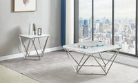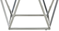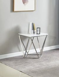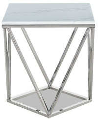 Lend an elegant accent to your living room with this Gandra end table. The geometric design of the chrome base creates eye-catching appeal that is sure to wow any guest. The solid stone tabletop with Carrara marble veneers offers a handsome contrast with unique dark veins running through the tabletop. Providing an ultra-modern aesthetic, this end table is made to enhance your space is a delectable way. Plus, its light tones allow this piece to be placed alongside most colour palettes.