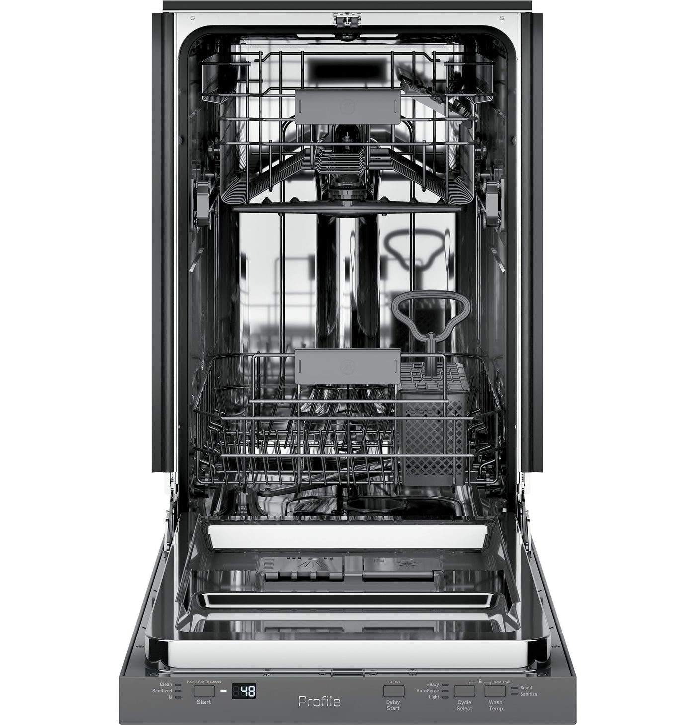 Enjoy the compact size of this 18-inch GE Profile top-control dishwasher without compromising any tough cleaning power. Featuring the Piranha™ hard food disposer, this dishwasher can blast away stuck-on messes with ease. The full stainless steel washtub resists staining and corrosion – plus, it promotes high temperatures for more efficient drying. This energy-efficient appliance operates at a quiet 47 decibels so you can run a wash cycle any time – even at night.