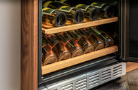 Keep your drinks perfectly cooled and ready to enjoy with this spacious GE Profile beverage centre. Four reversible wood and glass shelves can securely hold up to 52 wine bottles or 155 cans, so you’ll have all the room you need to stock up on your favourites. Adjust the temperature with digital controls and get a good look at every bottle thanks to bright LED interior lighting. The windowed door finished with a stainless steel trim makes this cooler a sophisticated addition to any entertaining or dining space.