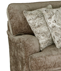 Make a refined style statement in your living space with this toffee Larkspur sofa. Cozy chenille fabric cloaks the furniture frame with a medium brown hue to create a warm, tasteful look. Elegant details, such as the carved wood feet and rollover armrests, give this piece traditional charm your guests will love. Ready to enjoy movie night with your family? You certainly will be when you relax on the thick high-density foam cushions lining the seat and back. With four throw pillows adding extra comfort, this Larkspur sofa is ready to receive anyone looking for a rest.
