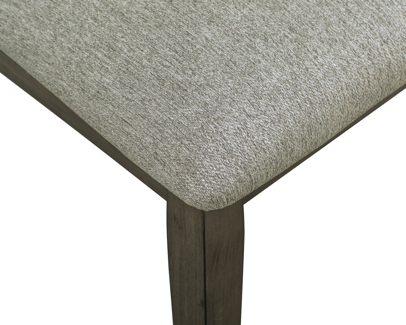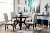 Turn an everyday meal into a lasting memory with this Hillview grey five-piece round dining package. Solid rubberwood and chinaberry wood combine for a rich grey finish that brings a touch of nature to your dining room. An angular trestle base keeps everything well supported while giving ample amounts of legroom. Soft grey polyester fabric covers a high, finely tufted chair back for a look that's both eye-catching and deliciously cozy. Simple and sturdy, this Hillview round dining package will help give you a close-knit dining experience where no one gets left in the corner.