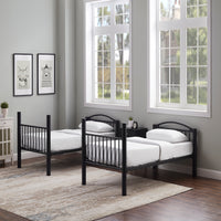 - It includes full-length guardrails and an integrated angled ladder that offers easy and safe access to the top bunk without obstructing the open space of the bottom bed.