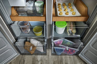 The full-width refrigerator tray slides out for easy access to large platters and ingredients, while the tray in the custom freeze zone is perfect for chilling and prepping.
