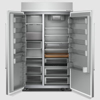 This stunning built-in refrigerator from KitchenAid contains innovative storage solutions for all of your groceries. An under-shelf prep zone gives you extra room for leftovers, appetizers and more without taking up shelf space. Plus, a beautiful wood-look sliding tray keeps your party platters stored and ready to serve. Temperature-controlled drawers ensure your produce is kept fresh for longer, so you can create delicious meals. With a stainless steel finish, a flat side-by-side door design and a built-in style, this appliance will add a gorgeous, contemporary look to truly elevate your kitchen space.