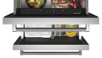 This KitchenAid under-counter fridge and freezer keeps your entertaining must-haves close by and ready to serve. The automatic ice maker ensures you’ll be stocked up for any occasion and interior lighting brightly displays all your hosting essentials, easily organized in the extra-deep 11-inch drawers. This model is also equipped with a temperature monitoring system which senses and alerts to fluctuations, so you know your drinks, ice and snacks will always be reliably cooled and primed to keep the party going.