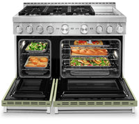 Satisfy your craving to create with this stunning 48-inch commercial-style range by KitchenAid. This dual fuel range combines a powerful six-burner cooktop with an electric double oven so you can cook for a crowd with confidence. The built-in electric griddle features precise temperature control and even heating to expertly brown, sear or crisp edge-to-edge. This smart range is compatible with your Google Assistant or an Amazon Alexa-enabled device to preheat, proof, bake and roast from anywhere using the KitchenAid app.