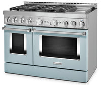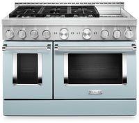 Satisfy your craving to create with this stunning 48-inch commercial-style range by KitchenAid. This dual fuel range combines a powerful six-burner cooktop with an electric double oven so you can cook for a crowd with confidence. The built-in electric griddle features precise temperature control and even heating to expertly brown, sear or crisp edge-to-edge. This smart range is compatible with your Google Assistant or an Amazon Alexa-enabled device to preheat, proof, bake and roast from anywhere using the KitchenAid app.