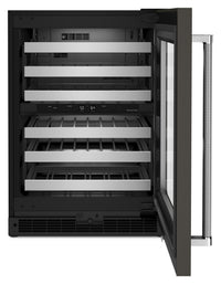 Enjoy a more refined tasting experience with this fabulous KitchenAid under-counter wine cellar. You’ll delight in every sip – precise temperature selection showcases the grapes’ flavours and aromas to really let your vino shine. Plus, the UV-protected glass door prevents damaging heat and light from altering taste. With room for 46 bottles, the metal-trimmed SatinGlide® shelves give easy access to your entire collection. A chic black stainless steel finish makes this appliance a sophisticated addition to any entertaining space.