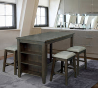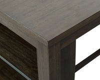 Enjoy the high life at this Lancer counter-height dining table. Crafted with solid acacia wood and veneers, this towering table's dark grey-brown finish adds a smoky, sophisticated allure to your home. The clean lines of this design offer an attractive profile, from the tapered legs to the table apron. But most appealing of all is the built-in display shelf. Featuring three levels of open storage, this piece makes for the perfect small-space solution.