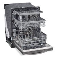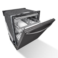 Look to this LG dishwasher for sparkling dishes every time. QuadWash technology gets the job done right the first time – four wash arms rotate back and forth while they spin to power-spray dishes from multiple angles, while Dynamic Dry™ with TrueSteam® reduces water spots up to 60%. With a National Sanitation Foundation® certification, you can rest easy knowing your dishwasher is safely sanitizing your family’s cutlery, glassware and plates while reducing bacteria by 99.999%. A sleek black stainless steel finish and LED top controls that stay hidden when the door is closed provide a stylish look fit for any kitchen.