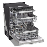 Upgrade the convenience in your kitchen with the high-pressure cleaning power of this LG dishwasher. LG's exclusive QuadWash Pro and Dynamic Heat Dry™ technologies combine to deliver the industry's leading one-hour wash and dry cycle for sparkling, table-ready dishes in less time. Plus, powerful steam softens dried on food for easier cleaning. Make use of the adjustable third rack for hard-to-fit items like flatware or long-handled utensils, and keep your kitchen looking its best thanks to a PrintProof® finish that wipes clean with a soft, dry cloth.