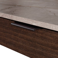 - Dark brown, umber wood finish is a striking contrast to the grey Deco stone tabletop.