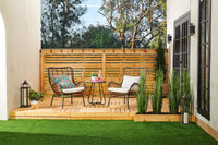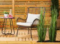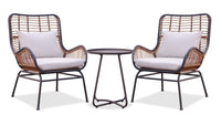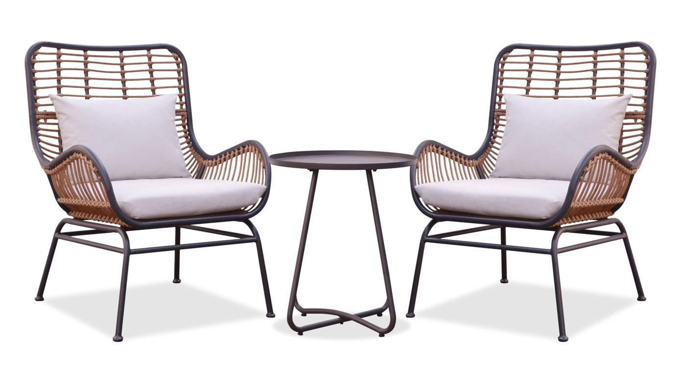 Take in the summer with leisure thanks to this three-piece Lisbon patio set. Two wide and cushioned armchairs with an accent coffee table let you enjoy those sunny days in style. The mid-century modern vibe of this set will add flair to your outdoor space, whether on your porch, balcony or by the pool. The scooped shape of the chairs allows you to lounge, while the back pillows provide support. Resin wicker is handwoven onto the frame of the chairs for added appeal. Plus, thanks to the durability created by a welded metal frame, the Lisbon will last for many luminous morning breakfasts and warmly lit nights.
