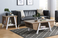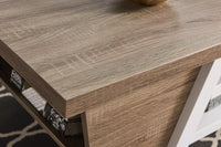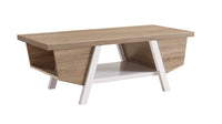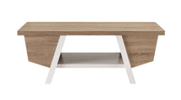 Striking a funky and angular mid-century silhouette, this Madigan coffee table brings the finishing touch to your photo-worthy living room. The broad white legs flare outward as a lower shelf spans between them, perfect for placing a fun home decor piece. On both sides, shelves angle upward so you can keep magazines neatly tucked away. The tabletop and shelves are finished in light wood tones to bring a vintage vibe. With this Madigan table, your classic style has arrived.
