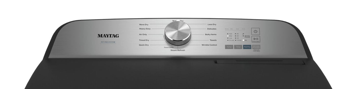 Enjoy a deep refresh on your laundry with this Maytag dryer. The Pet Pro option lifts pet hair off of clothes, then the XL lint trap stores it for easy cleaning. Steam features remove odours and prevent wrinkles so your clothes are ready to wear right out of the machine. Plus, Moisture Sensing avoids over- and under-drying to help extend the life of your garments. When you’re in a hurry to get out the door, make use of the Quick Cycle, which completes small loads in less time for incredible laundry day convenience.