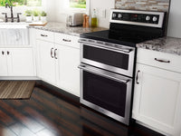 This Maytag freestanding electric double oven range boasts a sleek, stainless steel finish and a black, ceramic glass smoothtop cooking surface. Matching stainless steel bar handles and a rear electronic control panel add to the modern aesthetic. The automatic oven light illuminates your food for a clear view of the impressive cooking results, while the self-clean feature takes all of the hassle out of messy cleanups.