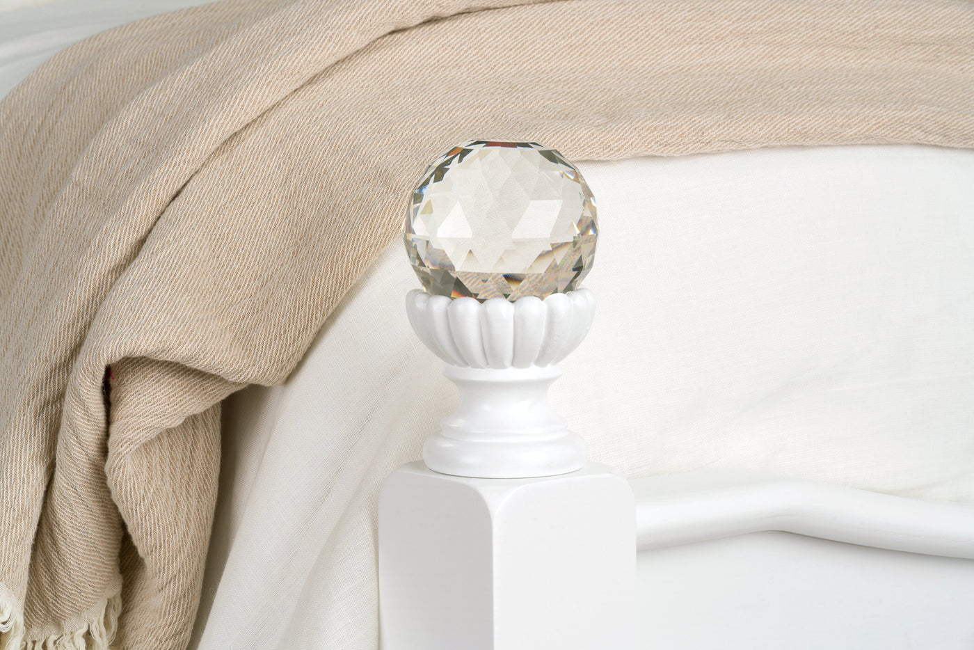 - Crystal ball finials give this bed extra shine.