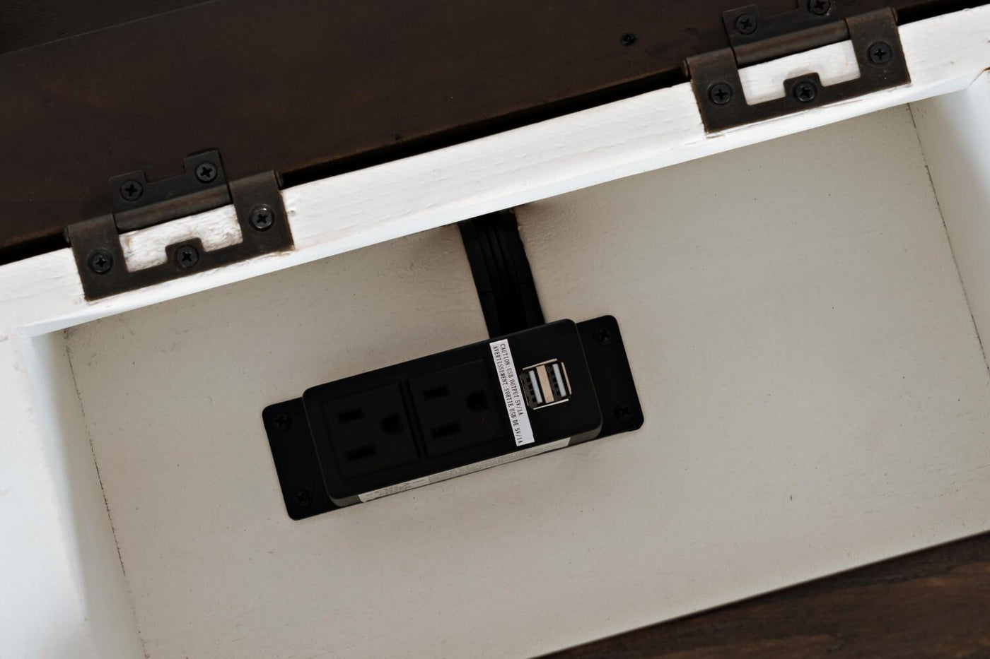 - Power strip with USB ports let you keep your phone charged and within easy reach.