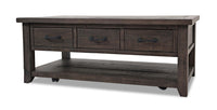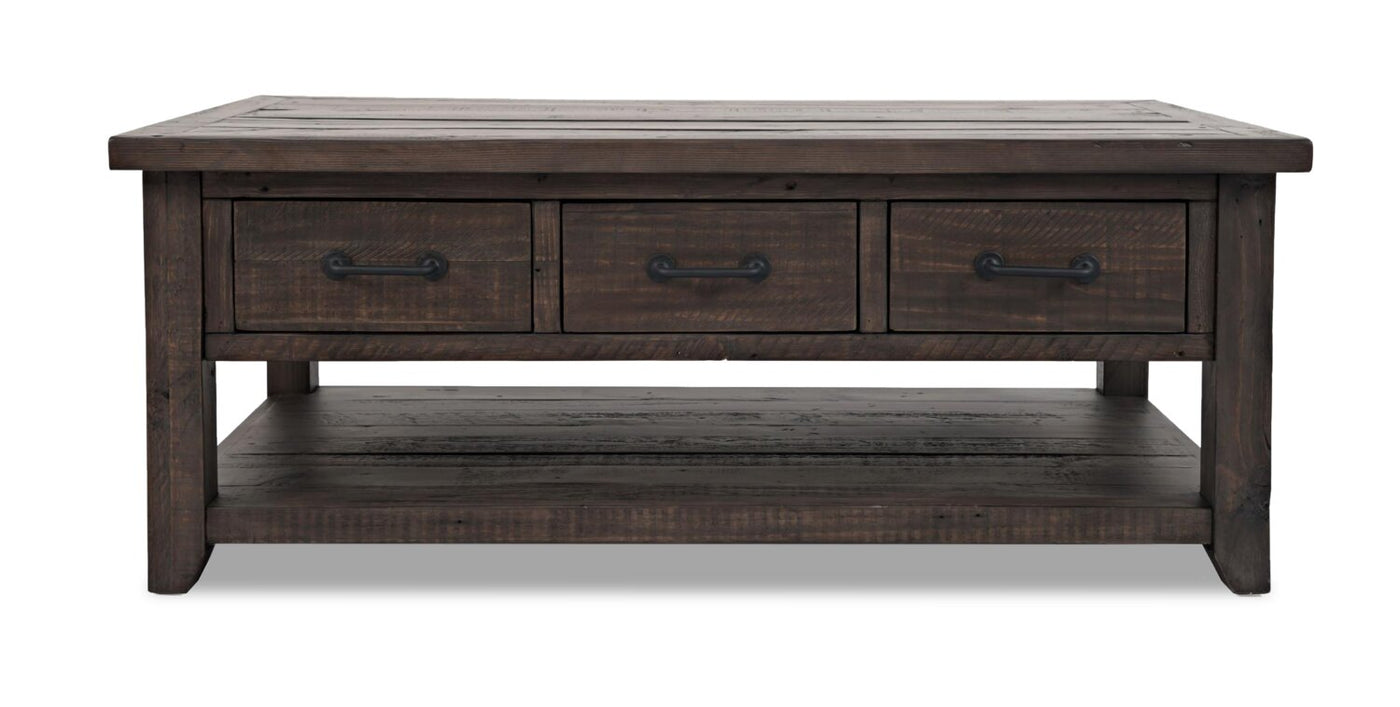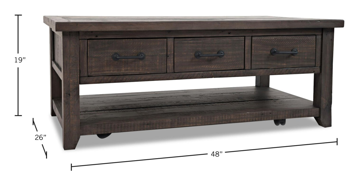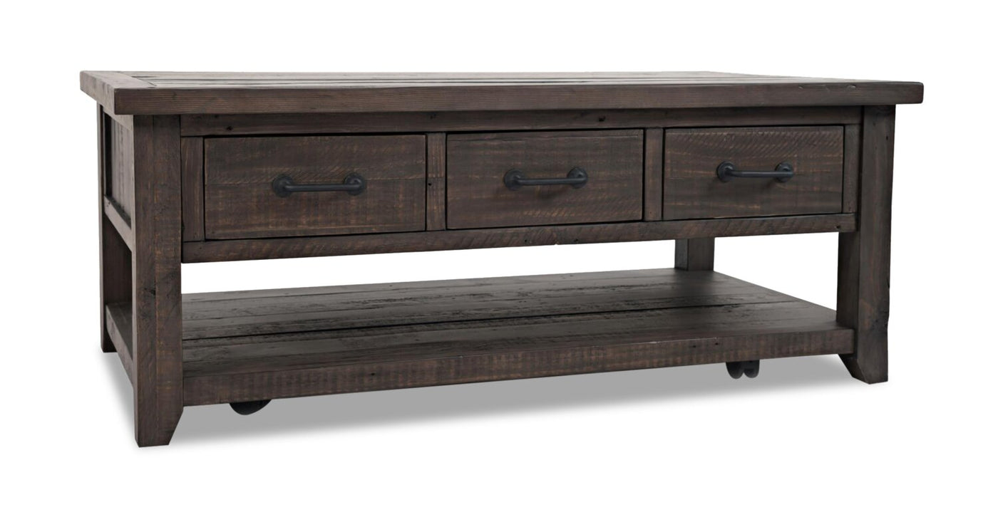 Give yourself some extra storage space with rustic charm to spare with this beautifully crafted Morgan coffee table. Constructed with reclaimed pine, this coffee table's rough-hewn finish radiates a stylish, artisan look. When it's time to tidy, casters allow you to easily roll the table wherever you want it. Three deep drawers can be pulled all the way through for handy storage of remotes, batteries and household essentials. Meanwhile, a lower shelf provides the perfect place for books or home decor pieces. Convenience comes with plenty of rugged character with this Morgan coffee table.