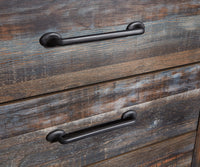 Hardware: Long, dark handles decorate the front of the drawers.