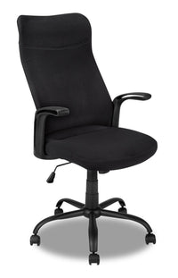 - This high-back executive office chair has fixed armrests in black polyester fabric.