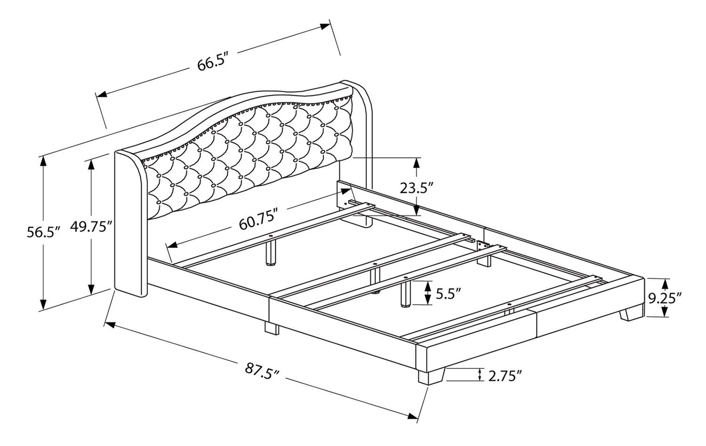 Give your bedroom a master touch with this exquisite Orin queen-size bed. With a frame and wingback headboard upholstered in a rich, light grey velvet-look fabric, this bed brings style to spare. The gently curved classic style of the floor-length headboard, outlined with a chrome nail head trim and cushioned diamond tufting, gives the bed a statement-making flair. Black solid wood legs, slightly angled at the front, add stability to the frame. With this glamorous Orin bed, your luxurious bedroom makeover has arrived.
