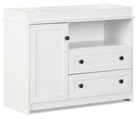 - Diaper changes are a breeze thanks to the plethora of storage options in this piece, including two roomy drawers, one side cabinet and a large open shelf.