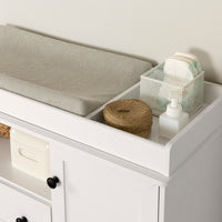 Evolve with ease as your baby grows thanks to this Pelmo changing table. Equipped with a removeable top portion, this dynamic piece can easily go from a changing table to a dresser in no time, making it the perfect choice for a growing child. Get your diaper changes done quickly with help from the plethora of storage options right where you need them. The large open shelf is ideal for placing diapers, while the two drawers and side cabinet can be used to tuck away larger items like clothes. Become the diaper changing hero of your household with this Pelmo changing table.