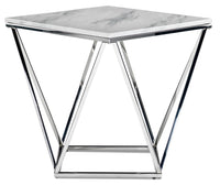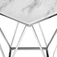 This modern end table, in a chrome finish, brings your sense of style to a whole new level. The geometric base and faux marble top adds a dramatic touch that will enhance any décor and be the focal point of any living space. Give your guests something to talk about with this chic, unique and totally on-trend end table.