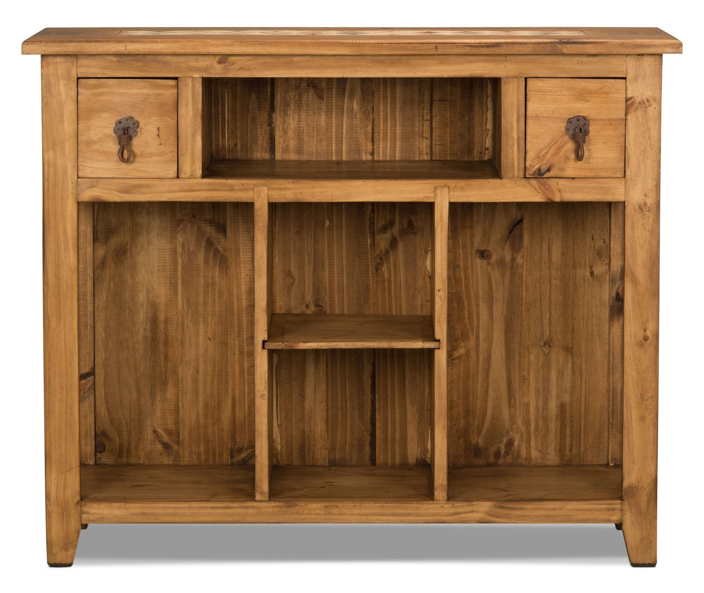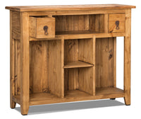 - Metal hardware completes the rustic design of this sofa table.