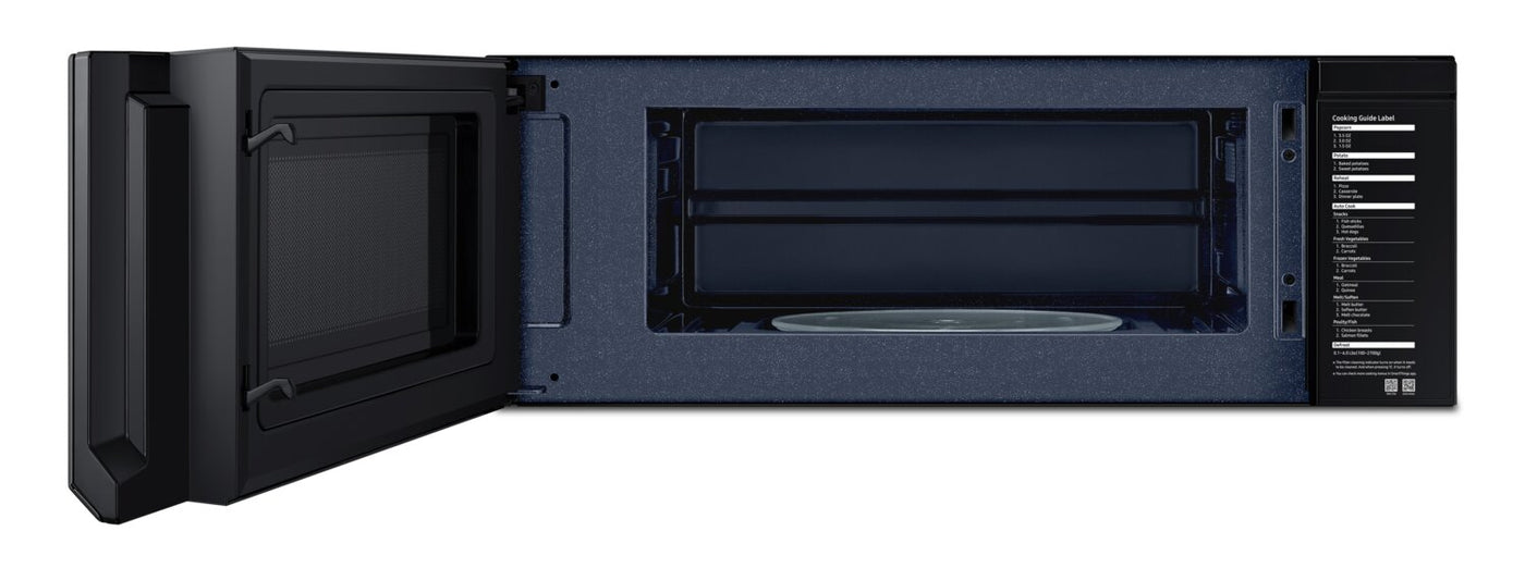 Enrich your kitchen décor with Samsung’s low-profile over-the-range microwave. Sleek space-saving design offers a 1.1-cubic-foot capacity within the slim frame, still accommodating a variety of snacks and meals. Plus, the powerful ventilation system ensures a more comfortable cooking environment, moving 400 cubic feet of air per minute (CFM) for continuously refreshed kitchen air. With its streamlined shape, ice blue LED display and sharp fingerprint-resistant finish, this microwave is a standout piece for the modern home.