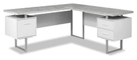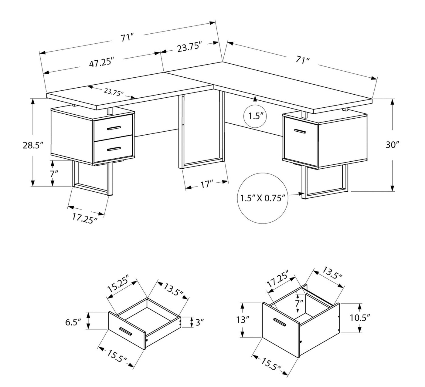 Give your home office a promotion with this extra-large Segundo desk. The L-shaped, floating desktop is generously sized and leaves space to use the top of the drawer units as shelves. A reversible configuration lets you set up the desk with the drawer units on either side as desired. The space between the three storage drawers allows ample room to easily move around your workspace. Providing support are three robust metal legs that match the drawer handles. This L-shaped computer desk saves space when used in a corner but is finished on all sides for a polished look wherever it is placed in a home office.