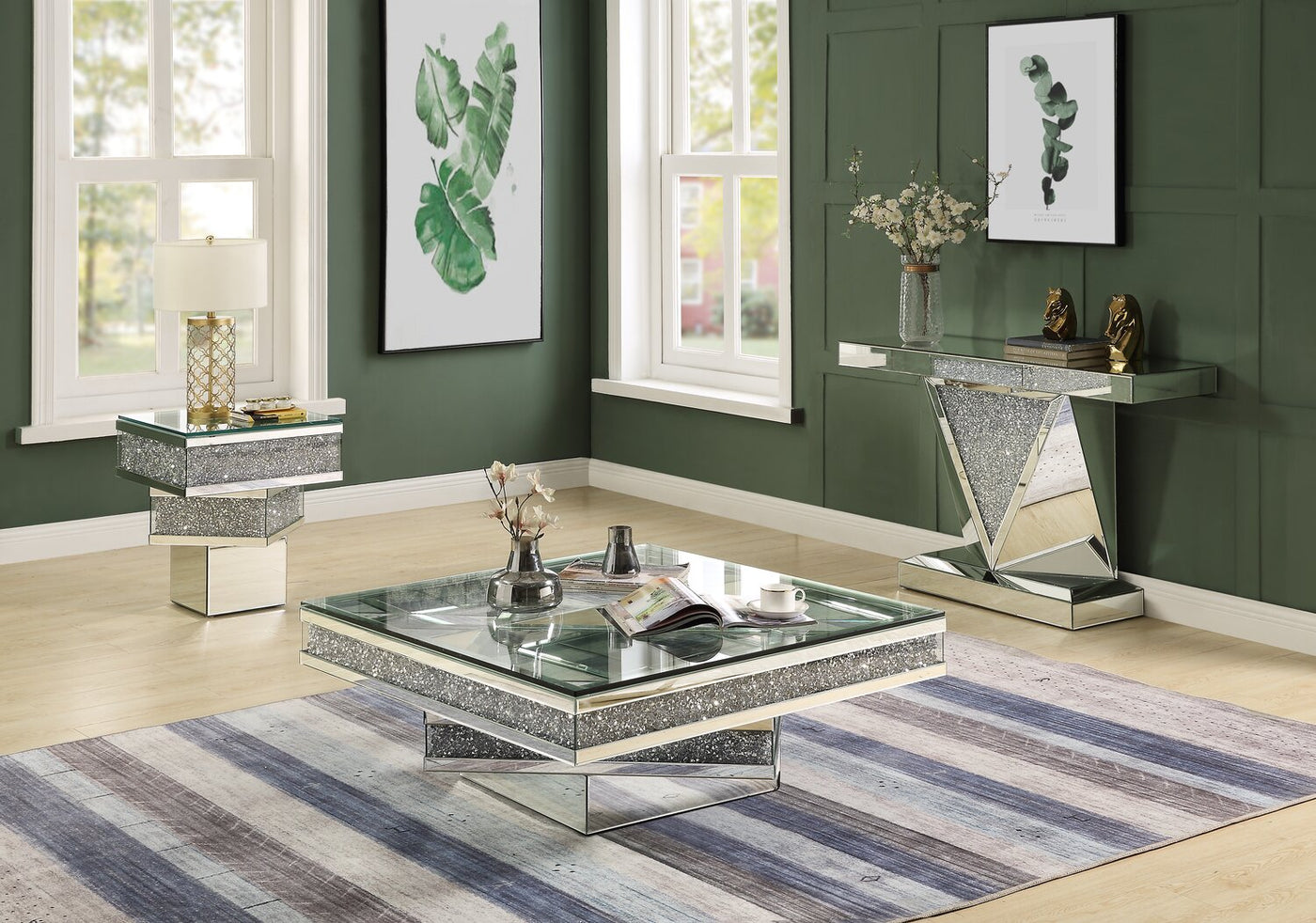 Glitz and glam aren’t just a style but a whole way of life with this dazzling Selby sofa table. With bold lines and starry shapes, this sofa table brings glistening, diamond-like angles to the forefront of your room. Enjoy the sleek appearance the large glass tabletop brings, while the acrylic crystals that fill the triangular front exude glamorous style. Perfect for displaying flowers or home decor pieces, place this table under wall art or lighting to watch it really pop. Hold nothing back with this ravishing Selby coffee table.