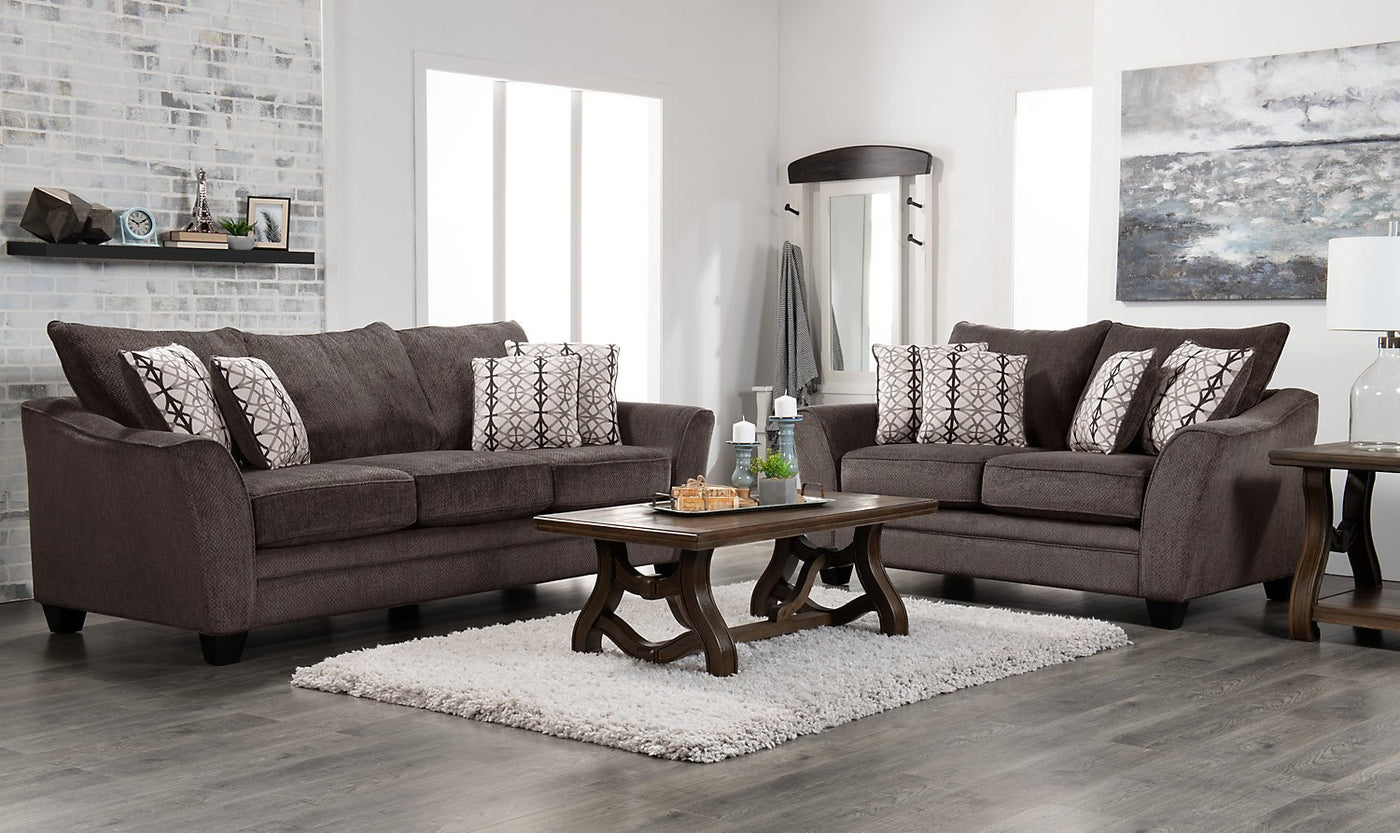 - Rich, brown chenille fabric envelops this sofa with softness.