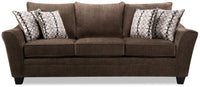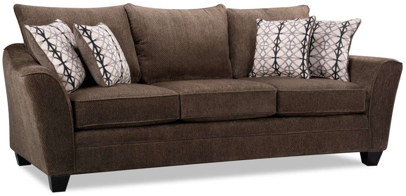Give your home an inviting and chic appeal with this brown Sherwood sofa. Cozy chenille covers the entire furniture frame for a seating space you'll want to relax on. Each of the seat cushions are filled with plush high-density foam, while the back cushions contain soft fibre fill to comfort your back. With flared armrests and finished in a dark brown hue, this sofa is a fantastic complement to many different home decor styles.