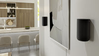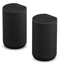 To match the compatible soundbars, the speakers are designed using an Omnidirectional Block concept. The cylindrical shape represents a single solid block providing 360° Spatial Sound and will fit perfectly against the wall with a flat rear surface.