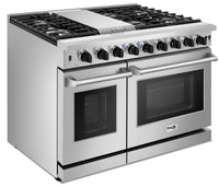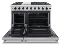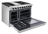 Big, bold and beautiful – this 48-inch Thor Kitchen gas range is the professional tool to take your cooking to the next level. Two ovens offer a staggering 6.8-cubic-foot capacity combined to let you execute several dishes at once. Plus, six stovetop burners provide a range of power and heat to accommodate every size of pot or pan. Detailed with industrial-style stovetop grates, minimalist control knobs, robust towel bar handles and a stainless steel finish, this appliance is as striking in design as it is powerful.