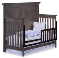 - Twain toddler rail in River Rock should be purchased at the same time as your crib. When the child becomes more active and starts to crawl the toddler rail replaces the front rail of the crib. The toddler rail bolts on to where the front rail was and allows the child to crawl out of the crib but not fall out
