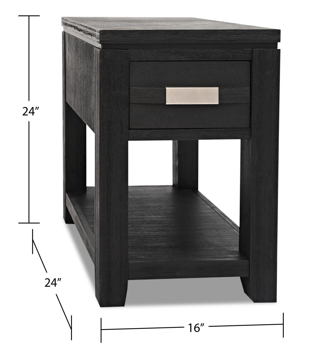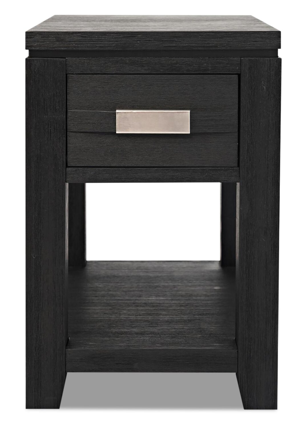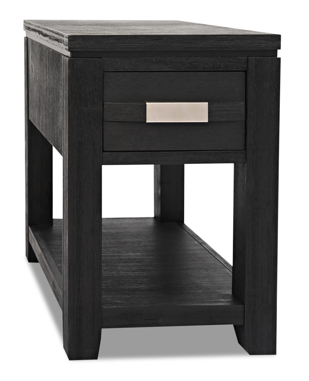 Arrange a handsome and handy chair side companion with this burly Vizela chairside table. Power and USB ports on the back means your electronics are always ready to go. Solid acacia wood is used for a durable build that exudes natural character, while a light distressing to the charcoal finish adds a touch of rustic charm. The lower shelf lends the perfect place for your favourite books while you stow the TV remote and batteries in the drawer above. Completed with a silver-coloured metal handle, this chairside table establishes strong and sturdy style.