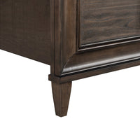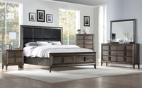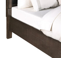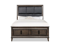 Handsome and robust, this Wallis queen bed is sure to command attention in your sleep space. A stately headboard featuring faux leather panels gives this piece a rock and roll flair while nicely complementing the rich brown finish of the bed frame. Easily tuck away bedroom items such as clothing in the two spacious drawers found along the footboard, which are accented with sleek dark hardware in a unique vertical orientation. Plus, wood construction makes this a sturdy spot to rest night after night. Introduce dapper style to your room with the Wallis queen bed.