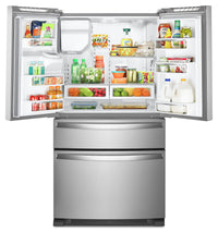 This Whirlpool 25-cubic-foot French-door refrigerator has everything you need and more to make life easier in the kitchen. Keep your favourite items within handy reach at all times in the exterior refrigerated drawer and free up storage space in the main area. This appliance also features Whirlpool’s Accu-Chill™ temperature management system, which automatically senses and adapts the fridge to just the right climate. This ENERGY STAR® certified refrigerator with LED lighting also gives you access to filtered ice and water without ever opening the door.