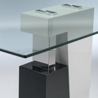 - The pedestal base is a work of art with clean geometric shapes finished in black, white high gloss and stainless steel and the glass top assists in showcasing the base.